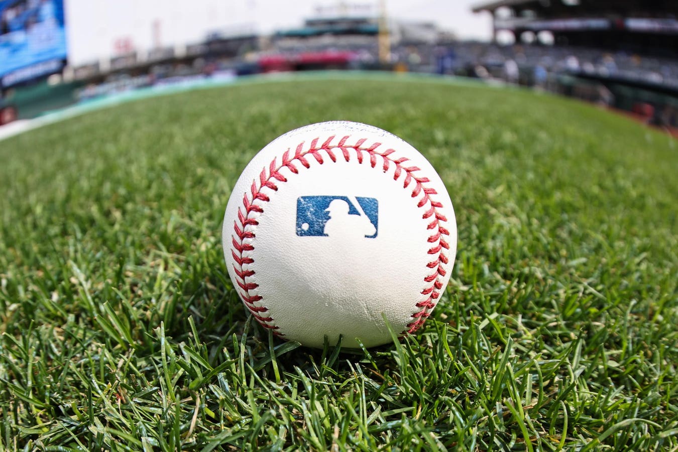 KANSAS CITY, MO - MARCH 27: A view of a baseball with an MLB logo on it before an Opening Day. (Photo by Scott Winters/Icon Sportswire via Getty Images)Icon Spo...